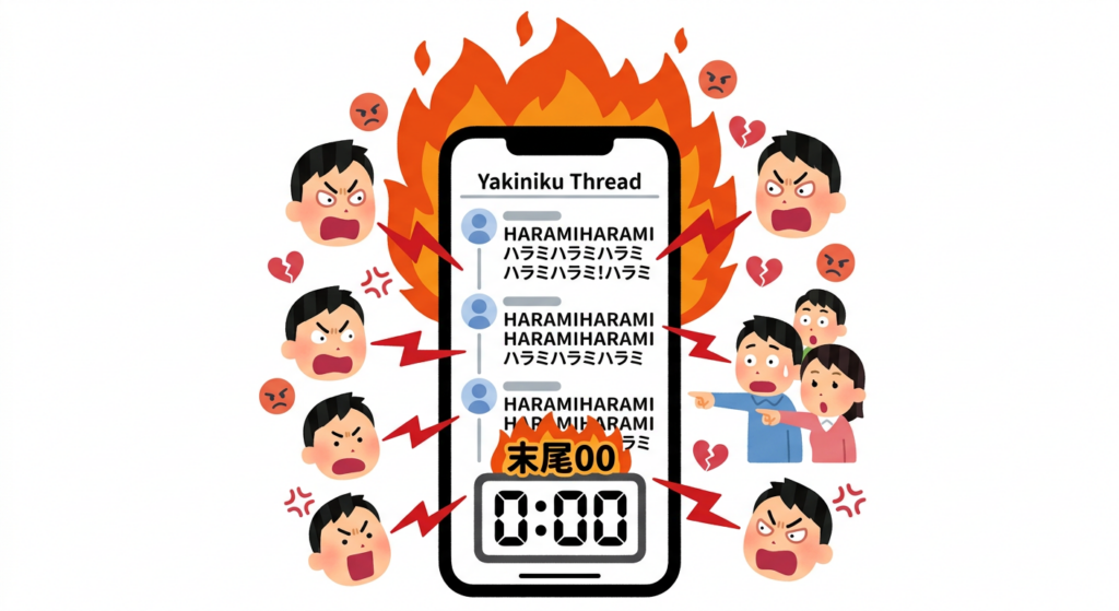焼肉スレに現れた「ハラミ連呼厨」の衝撃的な行動と、それに対するアンチの猛攻、さらには炎上を巡る攻防と自演疑惑でカオスと化したスレの全貌をまとめました。 -