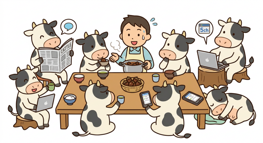 5chの「cattle」スレッドをまとめた記事。牛AAが織りなす日常、心温まる交流、まさかのどんぐり甘露煮失敗談、そして伝説のAA職人降臨まで、癒やしとカオスが詰まったスレッドの魅力をお届けします。